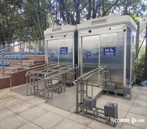 横琴国际网球中心增设的临时无障碍卫生间。 据介绍,为满足残特奥会举办需求,横琴国际网球中心从2024年开始进行改造提升工程,并于今年5月以最高等级“优秀”通过了残特奥会广东赛区执委会的无障碍环境检查,以高水平的组织、有温度的服务,保障每一位参赛者专注竞赛,成就梦想。 在硬件上,场馆基础设施完成无障碍适配,包括无障碍通道、盲道布局、无障碍停车位、无障碍洗手间、无障碍电梯等,确保轮椅运动员通行、训练、竞赛全程顺畅。还特别增设了临时无障碍卫生间,同时升级安防系统,兼顾安全保障与使用便利。